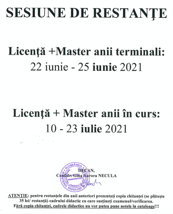 Atât sesiunea de examene, cât și sesiunea de restanțe (vară 2021) se vor desfășura online pe platforma Microsoft Teams.